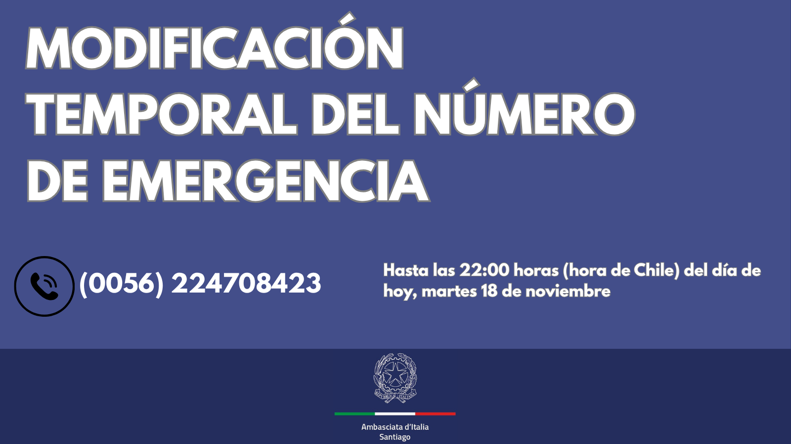 Estimados usuarios, hasta las 22:00 horas (hora de Chile) del día de hoy, martes 18 de noviembre, el número de teléfono de emergencia de la Embajada será el siguiente: (0056) 224708423