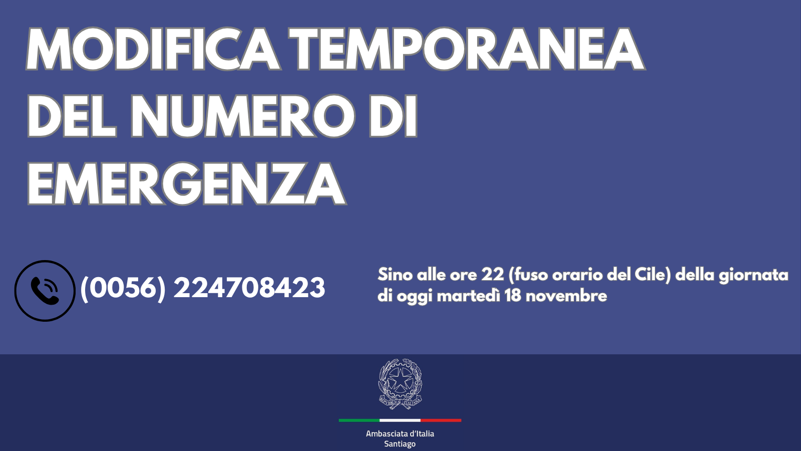 Gentili utenti, sino alle ore 22 (fuso orario del Cile) della giornata di oggi martedì 18 novembre, il numero del telefono di emergenza dell’Ambasciata sarà il seguente: (0056) 224708423